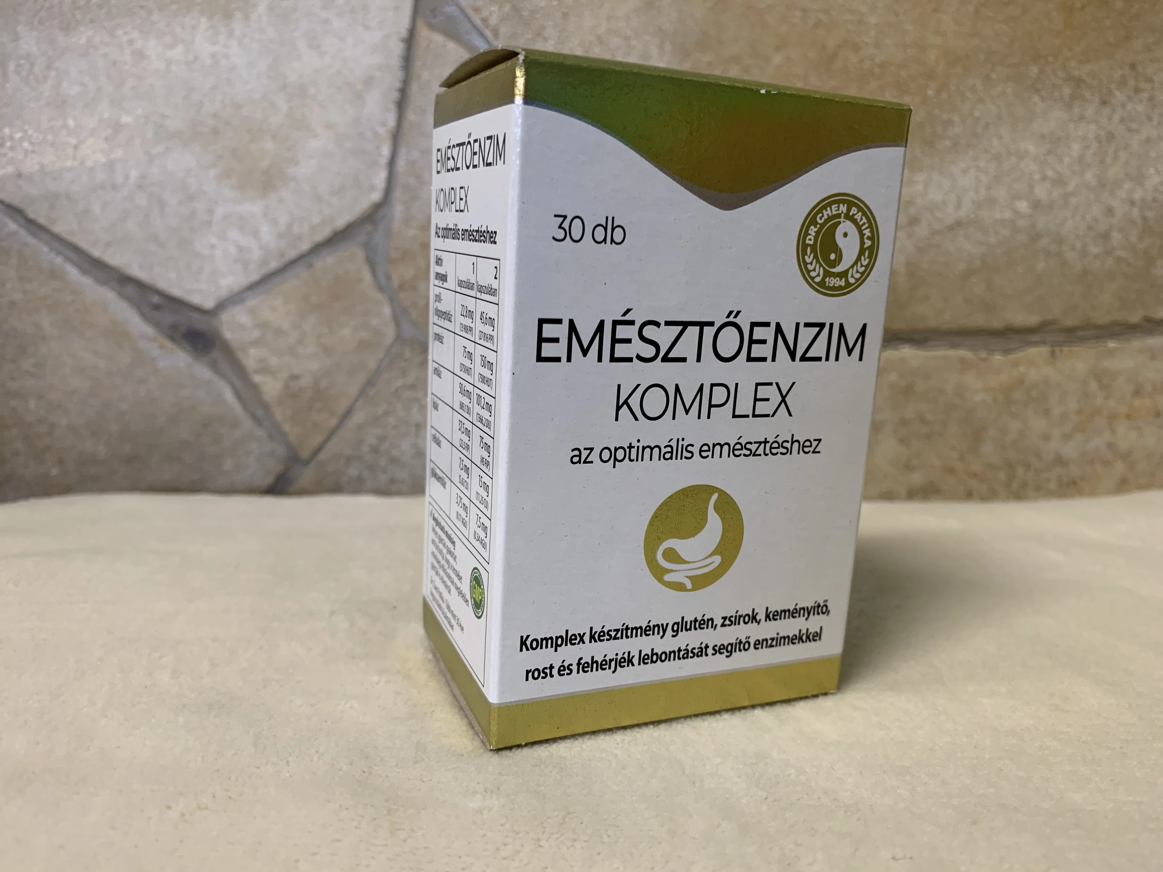 Összetevők: mikrokristályos cellulóz (tömegnövelő), enzimek (proteáz, amiláz, lipáz, prolil oligopeptidáz, celluláz, glukoamiláz), zselatin.