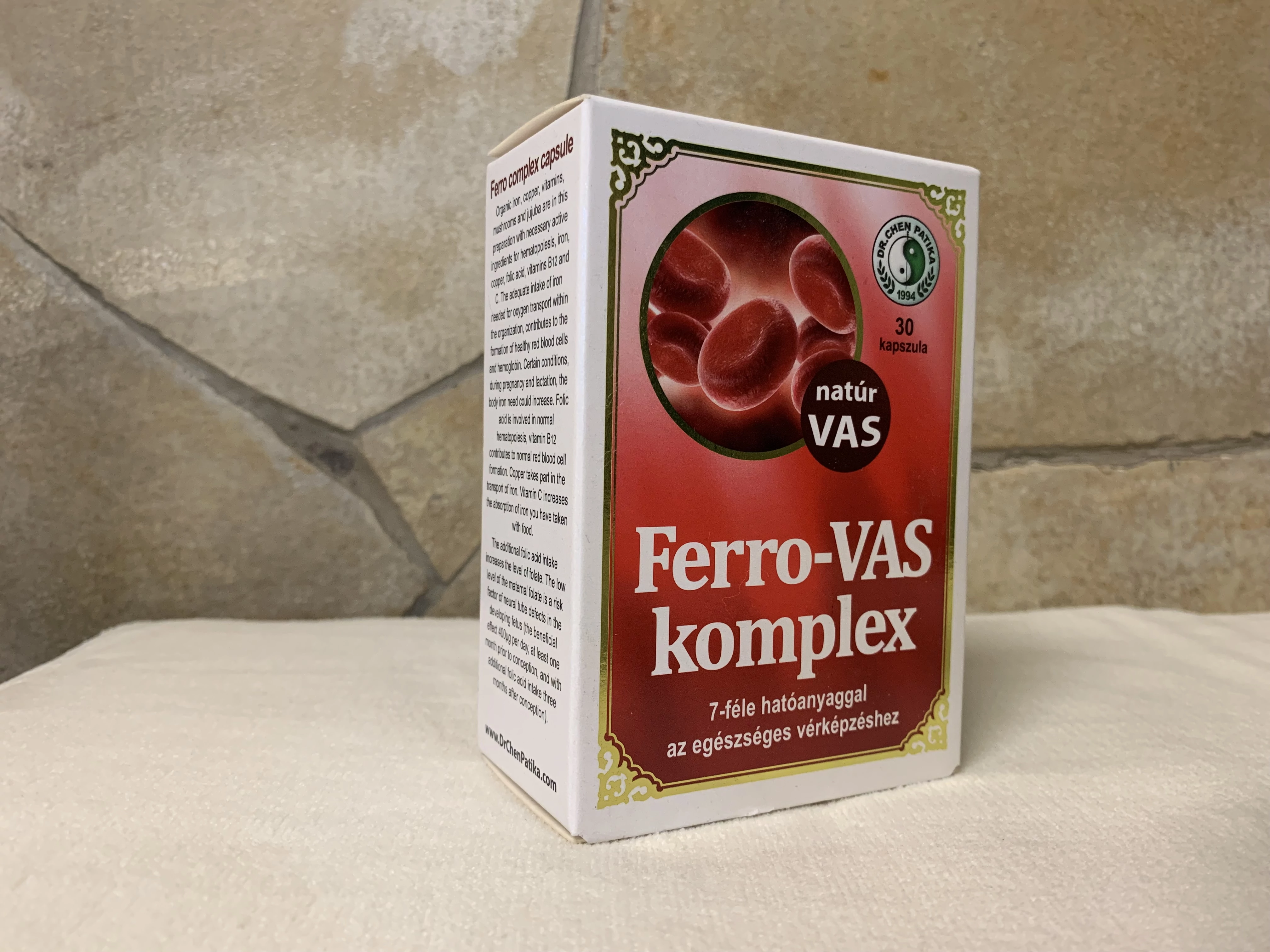 A Dr. Chen Ferro-Vas Komplex kapszula vasat, folsavat és B-vitaminokat tartalmaz, melyek együttesen támogatják a normál vérképzést és a fáradtság csökkentését. Praktikus, 30 darabos kiszerelésben, napi használatra kialakítva.